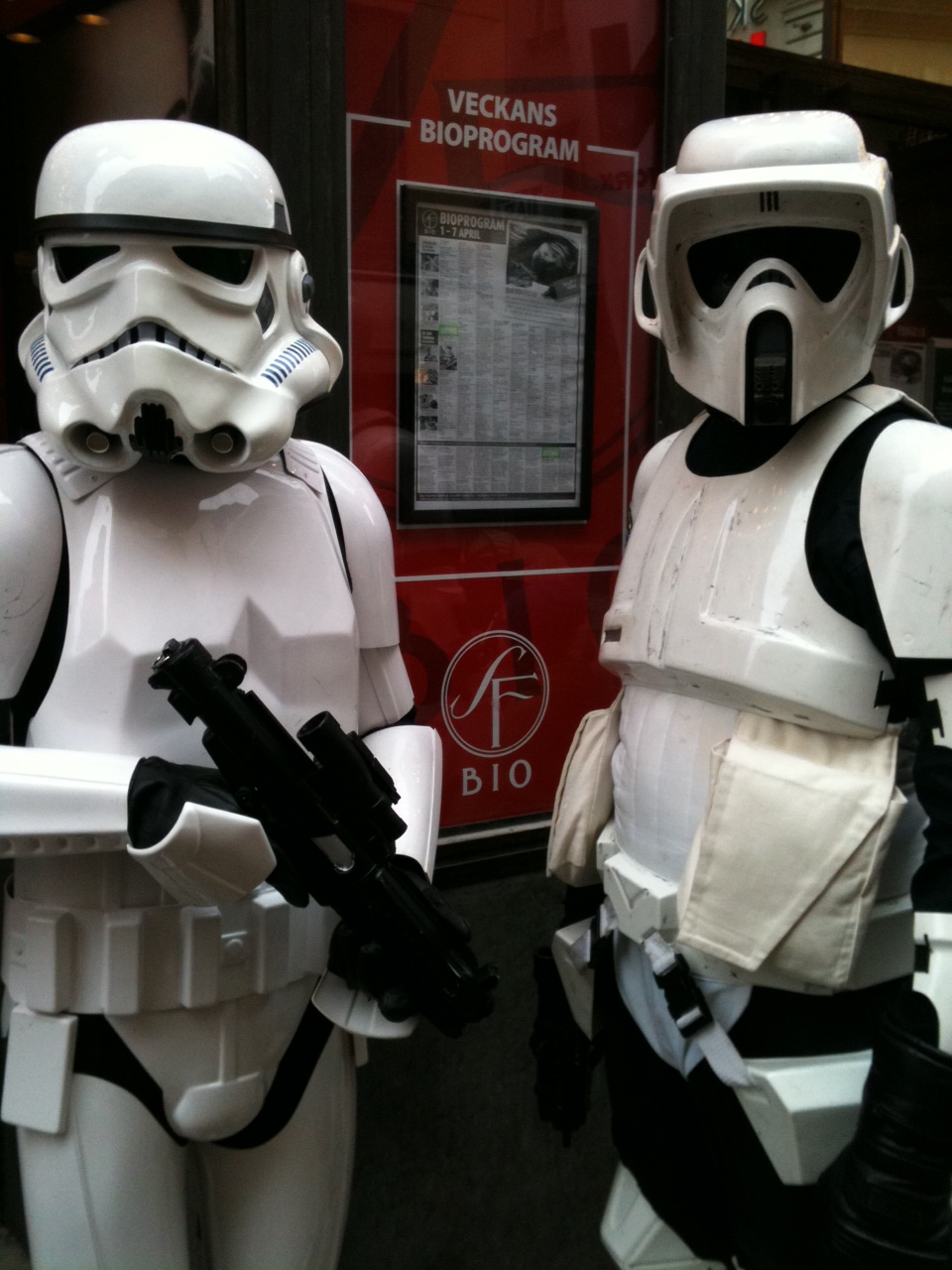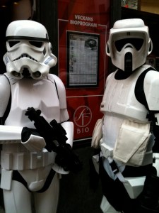 I går var vi på förhandsvisning av Star Wars Klonkrigen III på Skandia. Några kloner fanns förstås utanför och välkomnade besökarna. Gillade skarpt deras dräkter, undra hur man skulle tas emot om man kom klädd så vid något tillfälle.