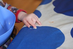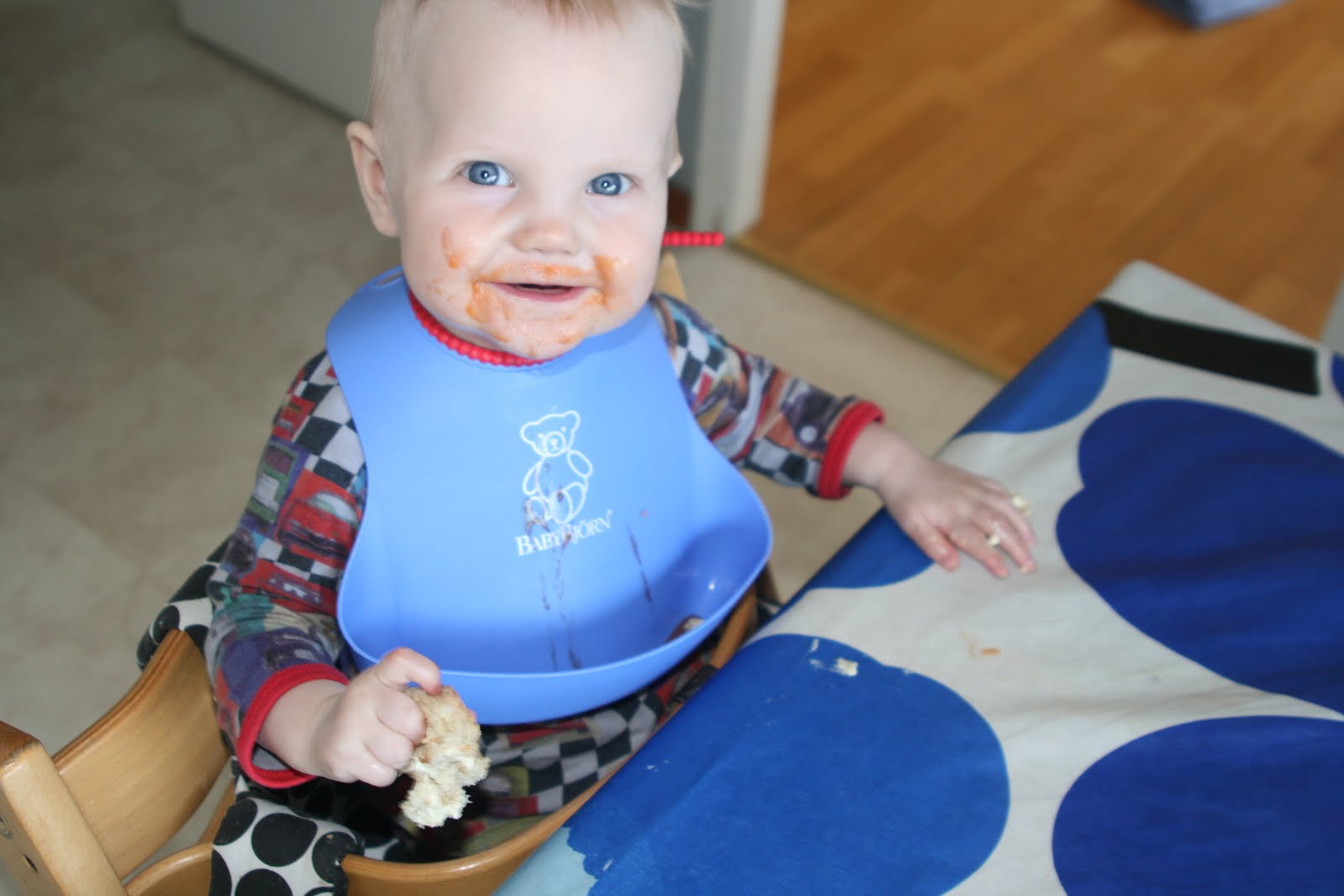 Lillsnurpan har nu blivit så pass duktig att äta att jag har vågat mig på att ge henne en liten bit smörgås att äta själv. Passade även på att låta henne äta smör (mjölkfritt). Hon har förstås fått det på andra sätt innan, men har inte velat ha när man givit henne på smörgås tidigare men tänkte att klassikern ”när hon äter själv” skulle funka och det gjorde det. Hon pulade glatt i sig både bröd och smör. Kladdigt blev det förstås.