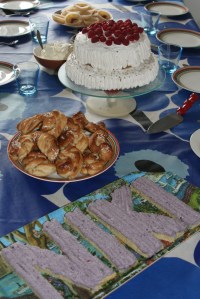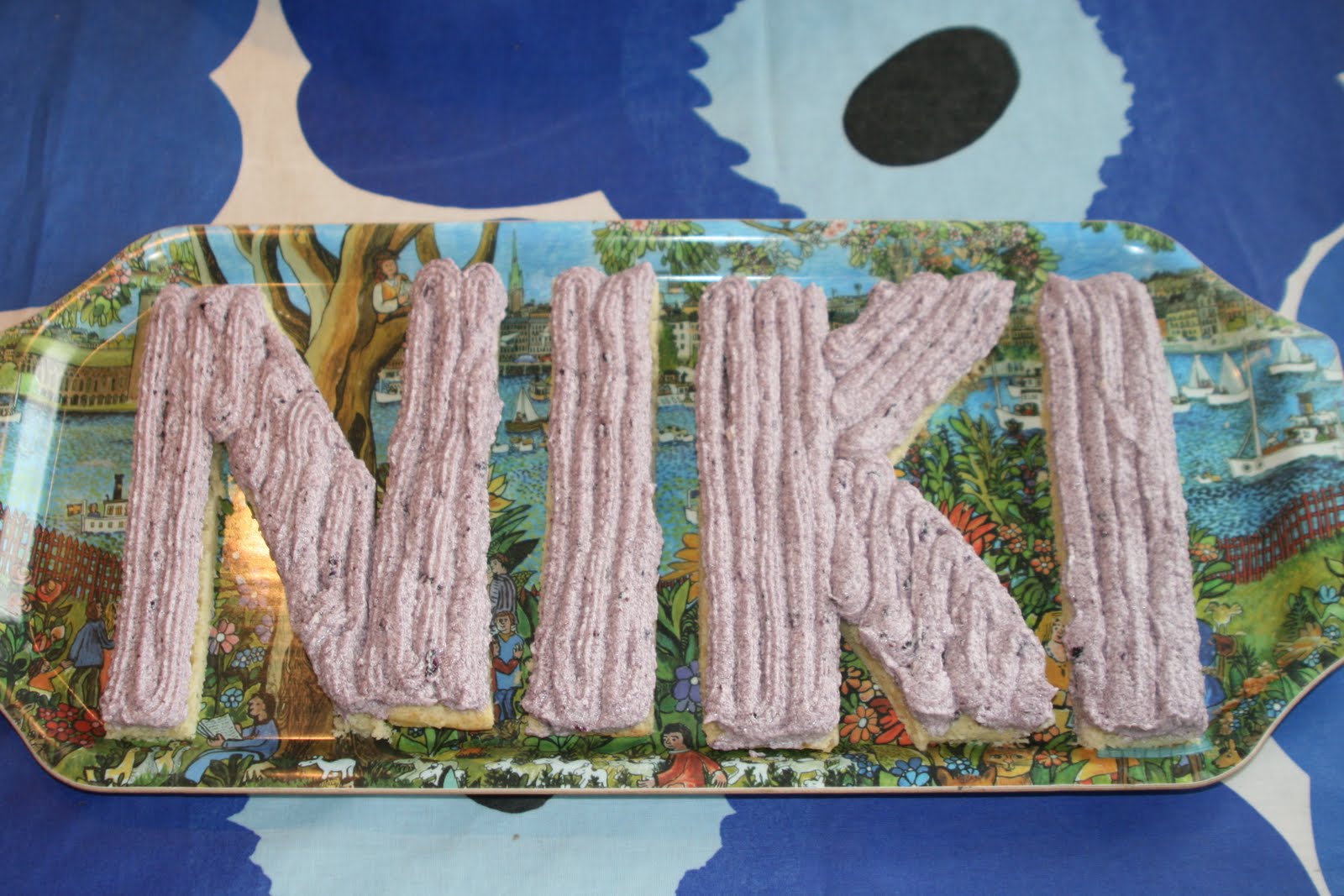Firade med kladdkaka (som var lite väl kladdig, nästan rinnande först då den stått framme i köket medan allt annat bakades, men efter några timmar i kylen var den ljuvlig) med grädde, tvåvåningsgräddtårta med banan- och chokladfyllning samt Niki-tårtan som jag gjorde genom att helt enkelt bara skära till en vanlig sockerkaksbotten och spritsade blåbärskräm på (blåbär, smör och florsocker). Storebror hade backat bullar och hallongrottor som förstås också gick åt. Dock har jag en del tårta kvar idag som jag får kämpa i mig. Mina sockervärden lär inte vara de bästa när dagen är slut…