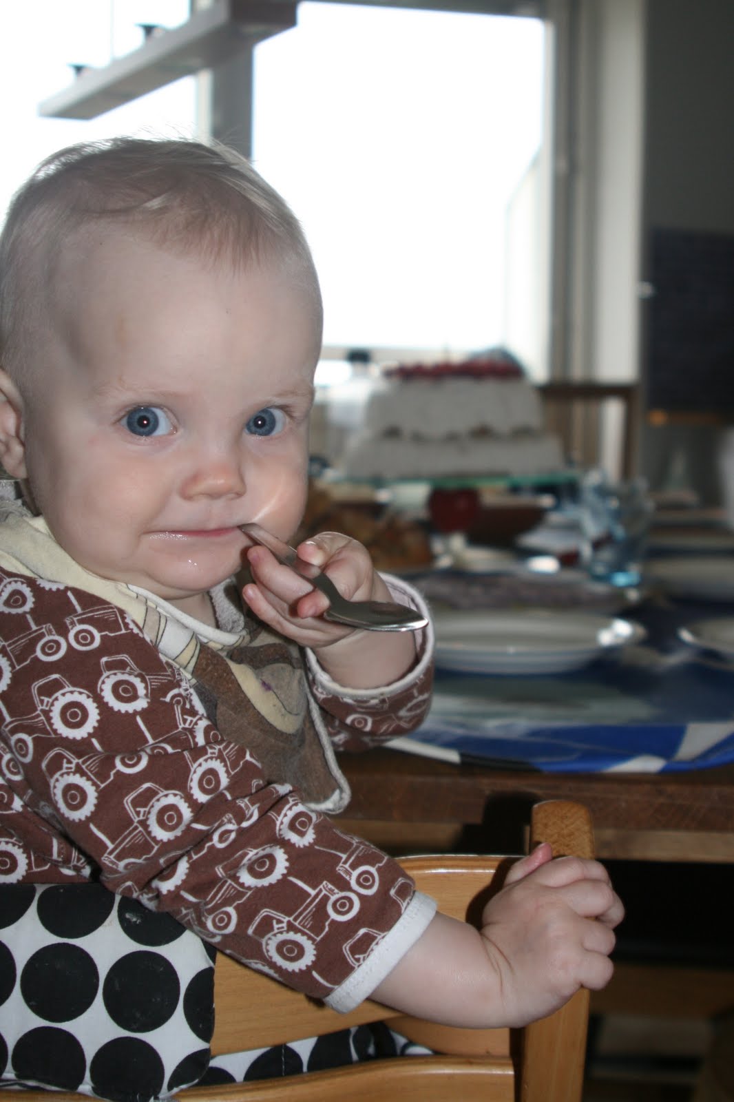 Så har det redan gått ett år sedan vår lilla snurpa behagade komma till oss. Just 1-årsdagen tycker jag att man förflyttas tillbaka just dit, till själva födelsen. Det heter ju födelsedag, men det är inte så ofta man tänker på ”födelse”. Men jag gör det då. Denna gång blev det dubbla känslor då det på några timmar när var exakt ett år mellan hennes födelse och då vi året innan det istället förlorade en. Att tänka på dessa två saker, den ena avgrundsdjup sorg och den andra obeskrivlig lycka, gjorde att jag under gårdagens firande var lite känslig. Men fira gjorde vi förstås. Hon fick för första gången smaka något så sött som tårta. Hade gjort en med blåbär, tänkte att jag kanske kunde inbilla mig att det inte är sååå väldigt onyttigt då…