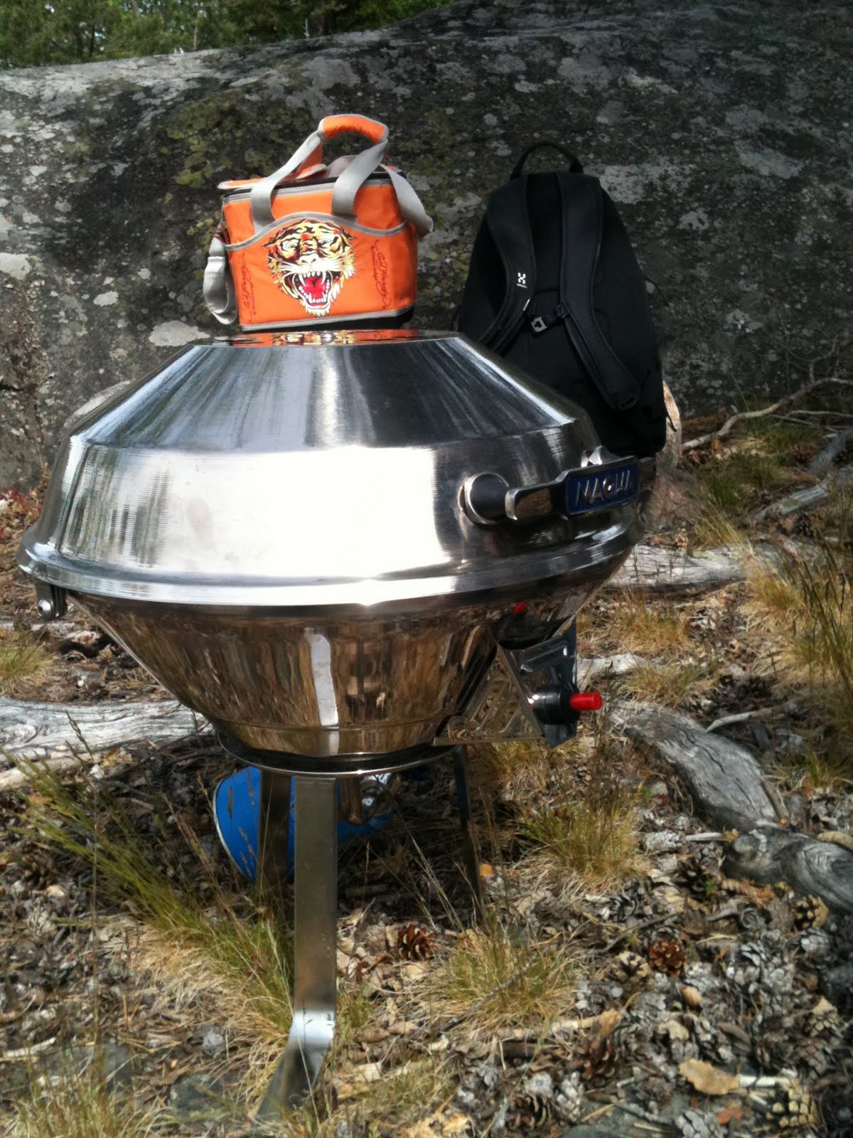 Den ”riktiga” lunchen blev grillad korv. Att engångsgrillar är miljöbovar är väl välkänt, så en sån här grill, Magma, är en toppeninvestering som jag verkligen kan rekommendera. Den har stativ att stå på som på bilden, men kan även fästas direkt på relingen i båten.