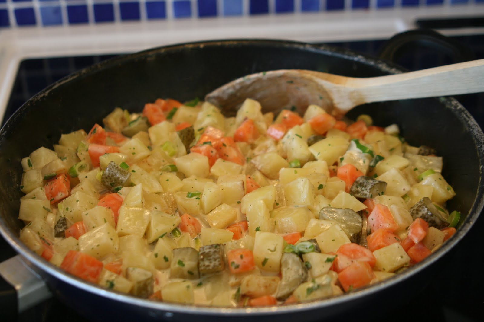 Skala potatis och morötter och stek i smör/olja i en stor stekpanna tills de börjar bli mjuka. Skölj och hacka under tiden salladslöken och dela saltgurkan i mindre bitar.