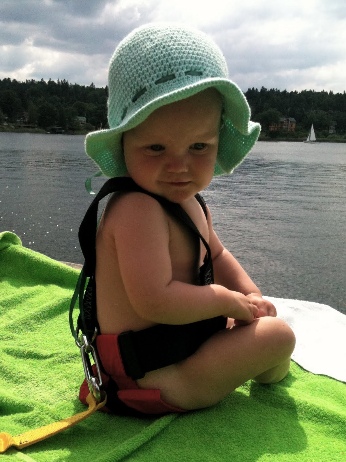 Att ha en liten ettåring som kan vara snabb som en vessla och kombinera detta med berg och sjö är inte alltid helt lätt. När vi är ute med båten är det självklart flytväst som gäller, men det finns andra tillfällen då det är onödigt och otympligt med det. Då använder vi sele istället. Förstår om man kan reagera negativt när man hör detta. Minns när jag själv hörde en vän säga (långt innan jag själv hade barn) att hon hade sin dotter i sele på tomten att det lät helt galet att göra så mot ett barn. En hund möjligen, men ett barn?! Förstår nu att det visst finns en mening med det… Den bråkdels sekund man kanske släpper kontakten med den lilla för att hjälpa syskon t.ex. kan räcka för att hon med världens fart kryper iväg och ramlar ner för klippan/druttar i vattnet eller något annat som för en så liten är direkt livsfarligt.