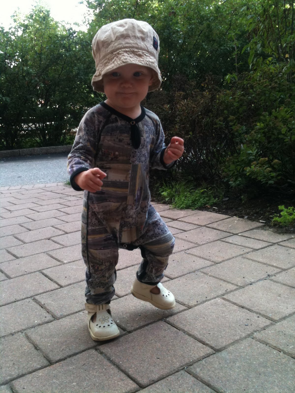 Stoltheten går väl inte att missta sig på?! Så nöjd över att kunna gå själv, även med skor på, ute i svår terräng. 😉