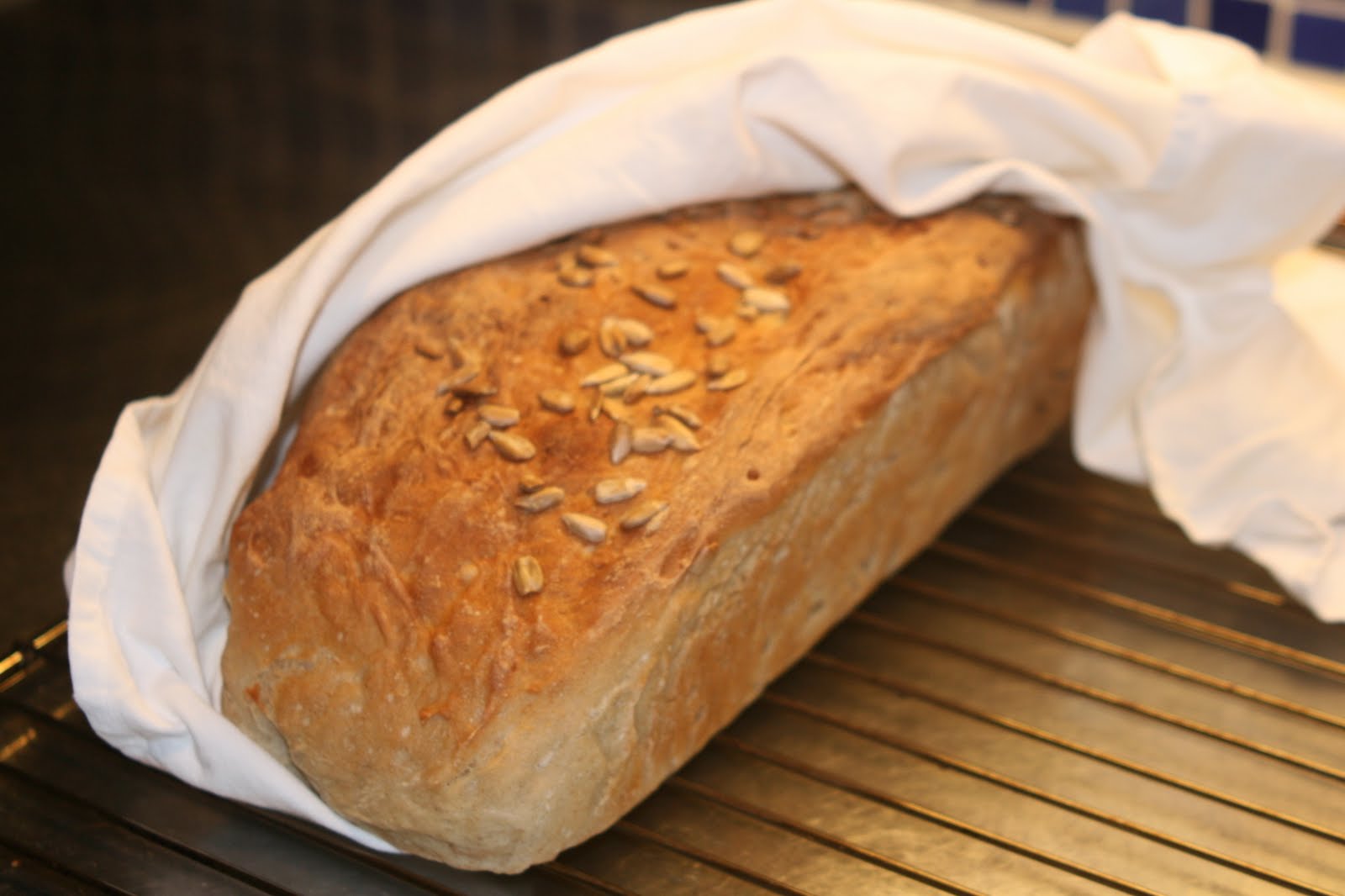 Så i brist på surdeg så tänkte jag att jag åtminstone skulle roa mig med att testa något nytt. Kollade lite på måfå och det blev först ett bröd från Söta saker som där kallas rätt och slätt Nybörjarbröd. Jag gillar rågsikt så jag tänkte att jag skulle testa. Följde receptet förutom att jag gjorde dubbel sats samt att jag använde mindre salt än vad som anges. Hade inga sesamfrön så jag tog solros istället – inte alls så snyggt då de rasade av efter gräddning… Men det blev ett gott bröd, särskilt i förhållande till hur få ingredienser och hur enkelt det var att göra. Dessutom kort jästid, så detta kan rekommenderas om man har kort tid på sig och snabbt vill ha ett nybakat bröd.