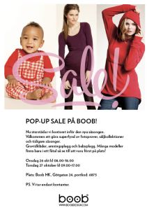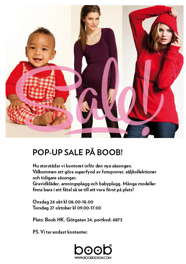 Den 26 – 27 oktober är det utförsäljning på Boobs huvudkontor på Götgatan. Jag kan tyvärr inte den tidpunkten, maximal otur, så typiskt. Men jag vill tipsa alla andra gravida eller ammande att passa på. Det brukar vara oförskämt billigt och bättre kläder går ju inte att hitta. Missa inte!