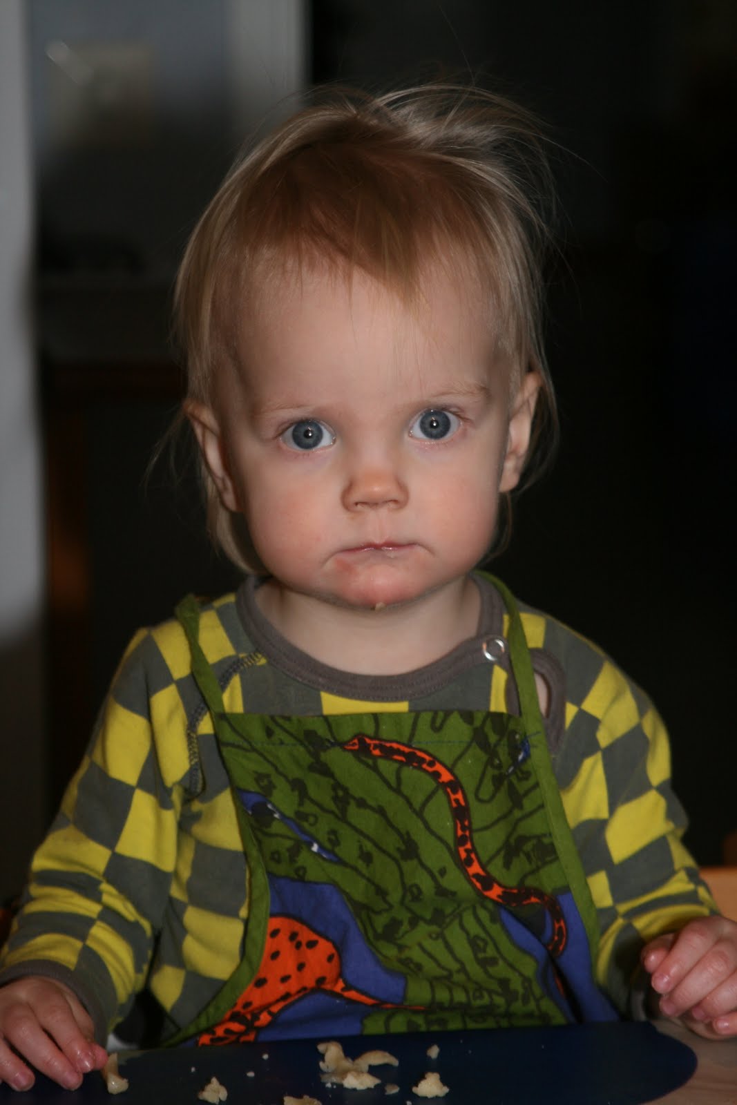 Fundersam 1-åring, denna gång med förkläde istället för haklapp som hon hade när vi bakade lussebullar.