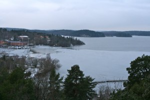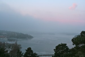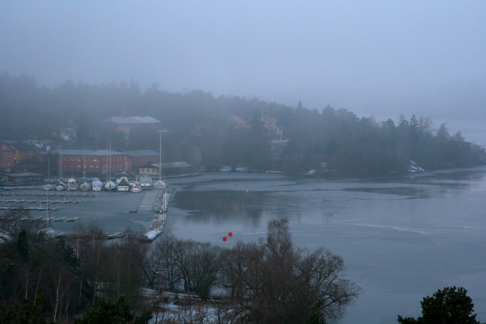 Det har ju inte varit särskilt kallt den här vintern men inatt var det plötsligt rätt många minus, för att vara den här vintern alltså. Det var -6,5 imorse och väldigt dimmigt. Solen försökte bryta igenom och skapade en rosaskimrande dimma. Så vackert. Och sjön hade en antydan till is: