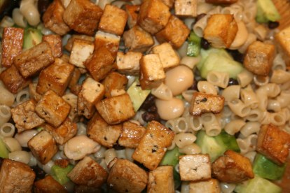 Koka makaronerna enligt anvisning på paketet. Skölj bönorna och låt rinna av. Skala gurkan och avokado och dela i mindre bitar. Tärna tofun och stek den i lite olja. Blanda olivolja, balsamico, salt och peppar efter smak och häll över makaronerna och rör runt. Blanda sedan med övriga ingredienser och toppa med stekt tofu överst.