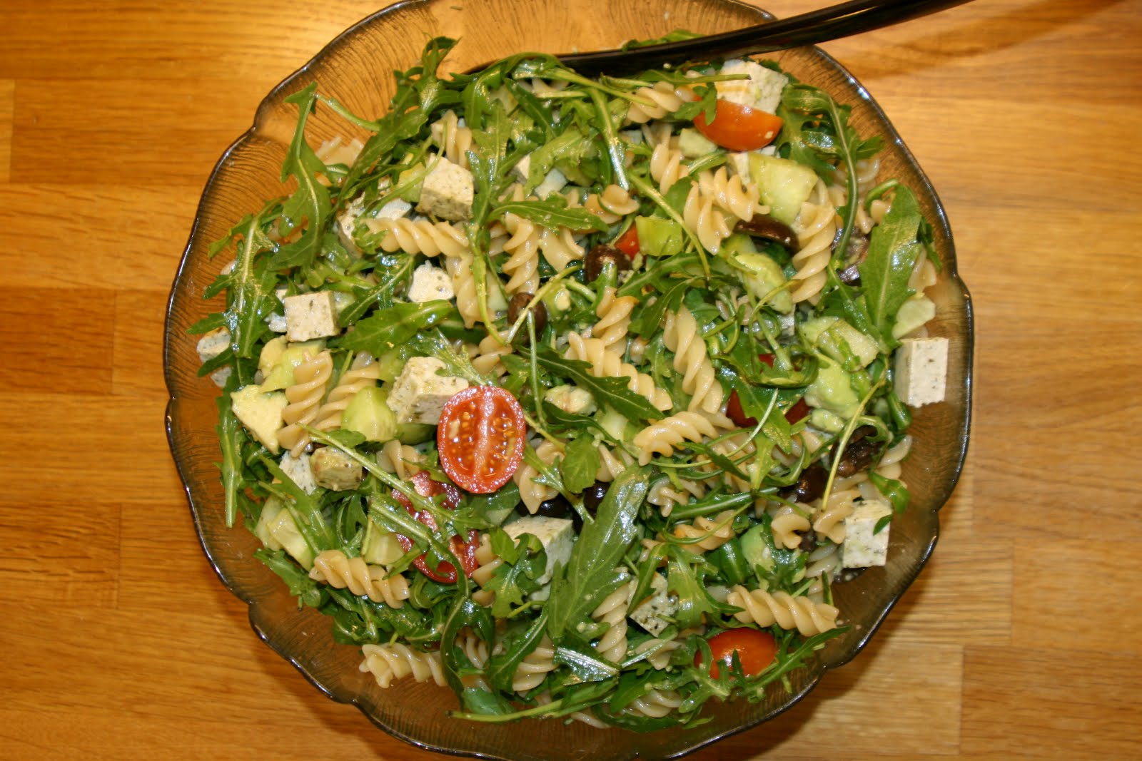 Halvera tomaterna och oliverna. Skala och hacka gurkan. Skölj bönorna. Dela tofun i mindre bitar. Blanda alla ingredienser tillsammans med pastan. Servera med t.ex. mer balsamico och ett gott bröd, t.ex. Dinkelbröd.