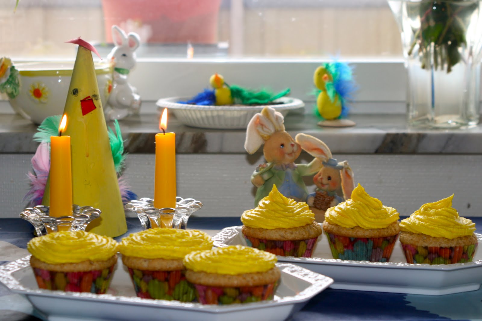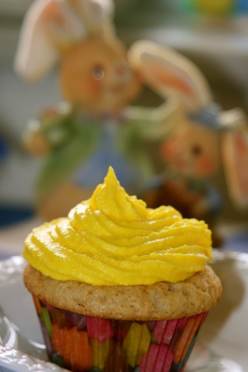 Dagens påskfika blev cupcakes med gul frosting. En väääldigt söt sådan får jag lov att tillstå. Jag bakade muffins på det här receptet från flickan & kakorna.
