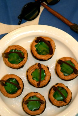 Smält chokladen och ringla sedan ut den på t.ex. bakplåtspapper till formen av handtag. Lägg dem i kylen eller frysen att stelna.Skär bort den allra översta biten på muffinsarna så att det blir en liten urgröpning för glasyren.Rör ihop florsocker, vatten och färg till lagom konstistens och färgnyans. Bred sedan ut glasyren på varje muffins.