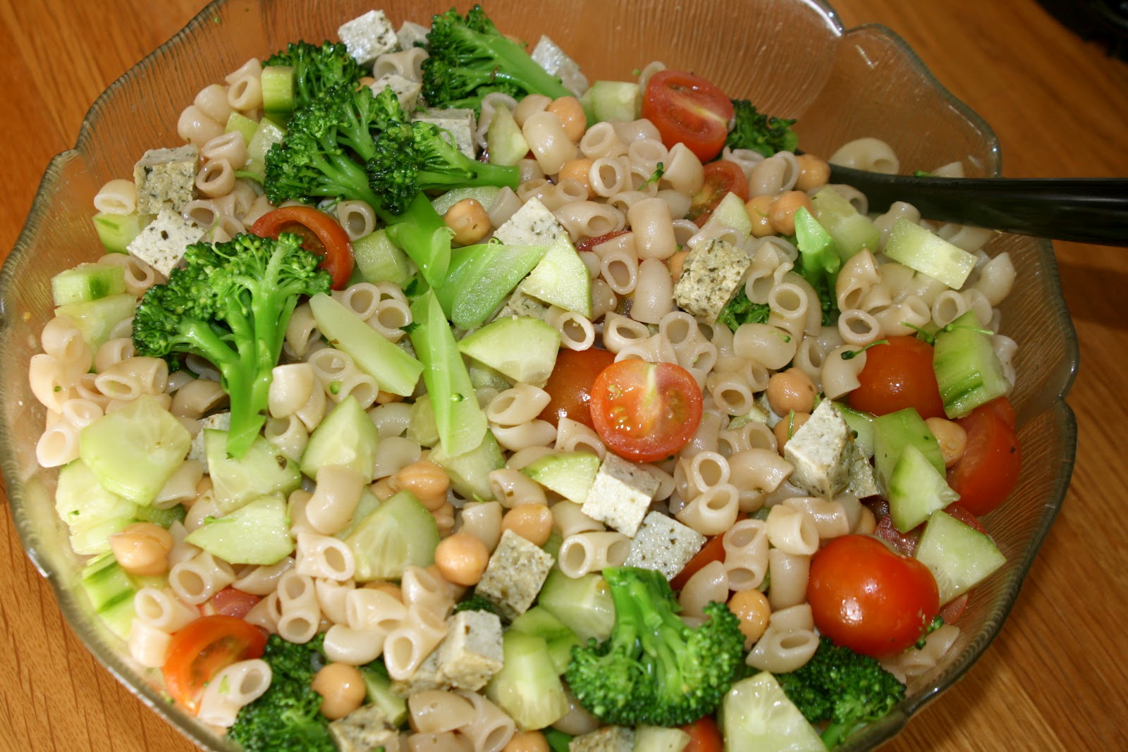 Koka makaroner enligt anvisning, häll sedan över olivolja, balsamico och kryddor efter smak. Koka broccolin i lättsaltat vatten och dela den sedan i mindre bitar. Skär tofun i kuber, hacka gurkan och halvera tomaterna. Skölj kikärtorna och blanda dem med övriga ingredienser.