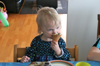 Första kalaset njöt vi bland annat av randig tårta och vid kalas nummer två var han helt bestämd med att han ville ha glass med tillbehör. Vi har alltid varit ”bra” på att blanda det mesta som är gott med glass i en skål, men nu ville han ha strutar. Lite svårare att blanda mycket i en strut, men vill man så går det. De fylldes med vanilj- och jordgubbsglass, hallon, blåbär, chokladbollar de luxe, grädde och chokladsås. Det var en rätt bra idé, förhoppningsvis finns det något av detta som alla barn tycker om.