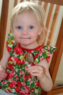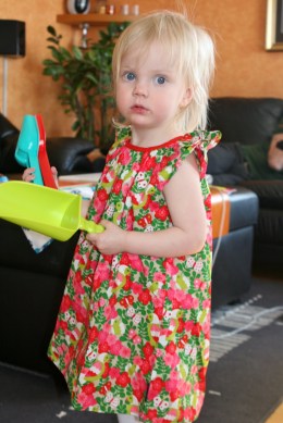 De verkade falla henne väl i smaken. Klänningen åkte snabbt av, på med strumpbyxor och nya klänningen och med nya, välbehövliga, spadar i högsta hugg ville hon ut och leka.
