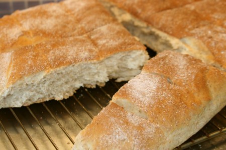 Stjälp upp degen i en långpanna klädd med bakplåtspapper. Strö över grahamsmjöl och platta ut degen i pannan. Skär degen i rutor med en vass kniv. Låt sedan jäsa övertäckt i 20 min.