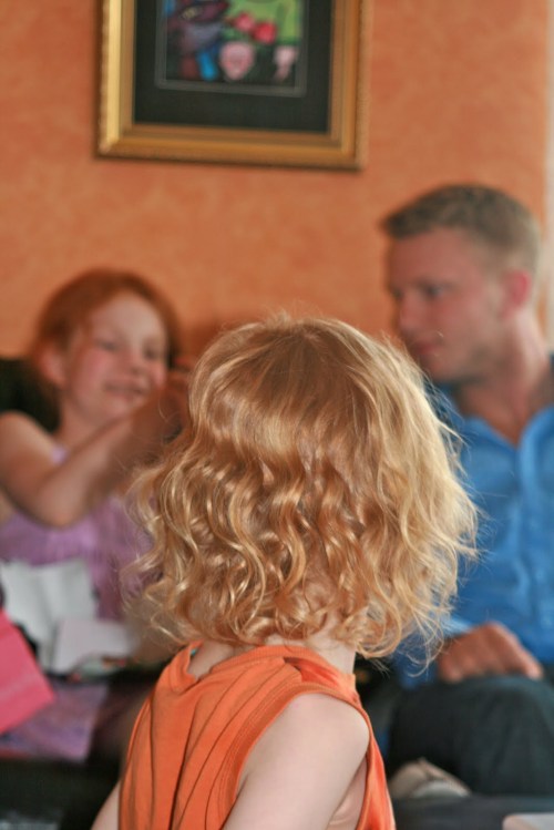 Innan fikat var det presentöppning. Här lilla guldlock som tittar på sina två äldre syskon.