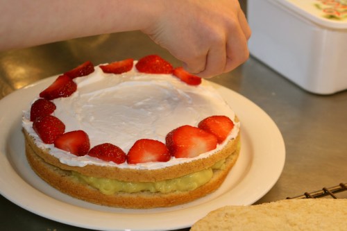 Efter ytterligare garnering med mer hallon och björnbär fortsatte hon med nästa. Den andra hade även den vaniljkräm på första lagret. På det andra grädde och halverade jordgubbar som lades i fint mönster. Toppad med grädde, jordgubbar och hallon. Ett riktigt mästerverk tycker jag!