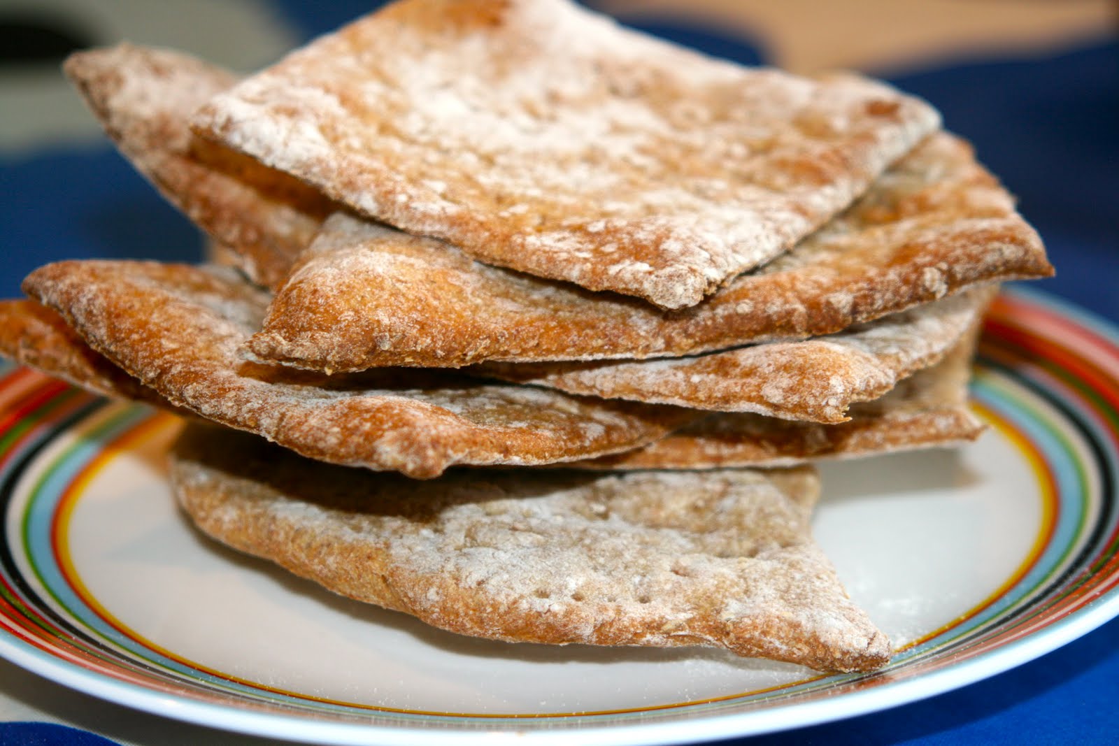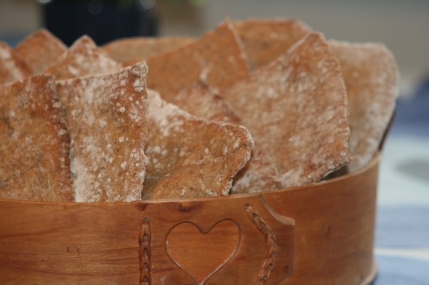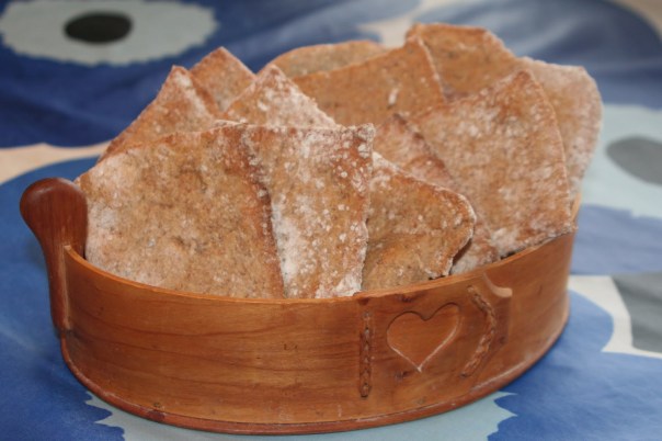 Jag följde receptet precis. Vad en nybörjare som jag skulle behövt är dock lite vägledning hur tunna ”tunna kakor” är. Och hur stora de skulle göras. Blir det skillnad att kavla ut ett par jättestora och grädda, eller bör man dela dem redan innan gräddning? Jag tror att mina kunde kavlats ytterligare lite tunnare, även om de blev hårda och goda. Men just tack vare det så tror jag smaken skulle kommit fram ännu bättre med ett litet promillesnäpp tunnare ändå. Och sedan naggade jag med gaffel lite grann då jag faktiskt inte äger någon kruskavel (!).