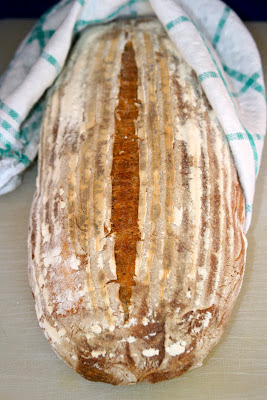 Ta upp degen på mjölat bakbord och dela den i två delar. Lägg dem i jäskorg (om du inte har jäskorg kan man lägga handduk på sidorna för att stötta upp bröden lite). Täck och ställ i kylen att jäsa över natten.
