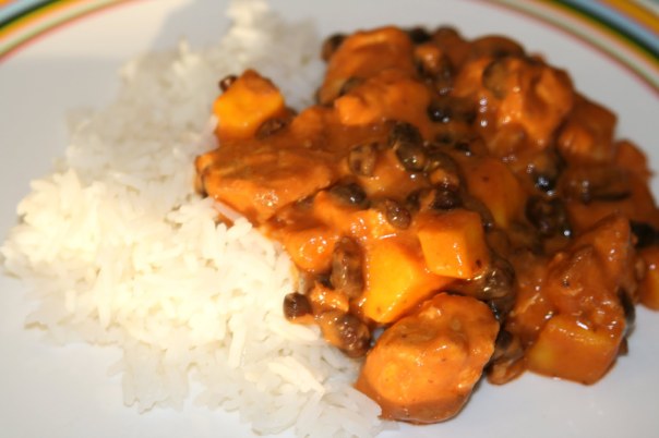 Fräs chi chi några minuter i olja tills de är klara. Finhacka vitlöken och ingefäran. Fräs vitlök, ingefära, tomatpuré och kryddor i olja i en gryta. Smula över buljongtärningen, tillsätt chi chi och häll på grädde och havregurt. Låt puttra några minuter. Skölj bönorna och rör ner dem och mangon. Smaka av om du behöver krydda ytterligare. Servera med ris.