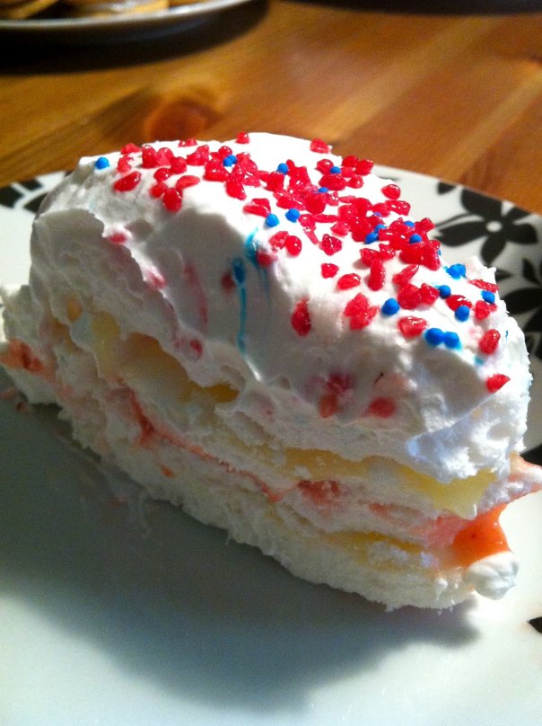 För ett tag sedan bakade jag en prickig tårta inspirerat från boken Kalaskul tårtor. En annan tårta som testats är den som i boken går under namnet ”Snabbaste tårtan i stan”. Den är verkligen snabb och fånigt enkel, i alla fall om du har ingredienserna hemma. Ska du ställa dig och baka marängbottnar så tar det ju en stund, men om du har gjort det sedan innan så går det på några minuter att fixa denna.