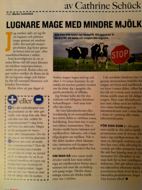 I Tara var det en liten artikel om att man får lugnare mage och mår bättre om man utesluter mjölk. Och så är det för de flesta. Även om man inte är direkt allergisk så reagerar väldigt många mer eller mindre på mjölkprotein.