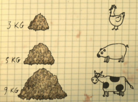Några enkla siffror: för att föda upp 1 kg gris går det åt 4 900 liter vatten, till 1 kg nötkött 15 500 liter. Det är vad en människa skulle göra av med om hen stod i duschen ett år i sträck. Jämför man istället med vad man skulle kunna få för föda för det så kan man t.ex. få 160 kg potatis för motsvarande 1 kg kött.