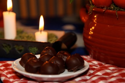 Rulla små bollar av pepparkaksdeg, smält choklad och rulla bollarna i den. In i kylen för att stelna, sedan bara att äta och njuta.