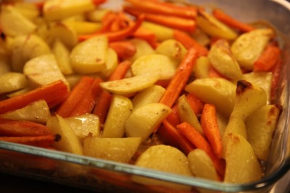 Skala potatis och morötter. Dela potatisen i bitar och skär morötterna i stavar. Blanda potatis och morötter med oljan och kryddorna. Fördela rotsakerna över färsen och sätt in i ugnen i 225°C i ca 30 minuter tills rotsakerna är mjuka.