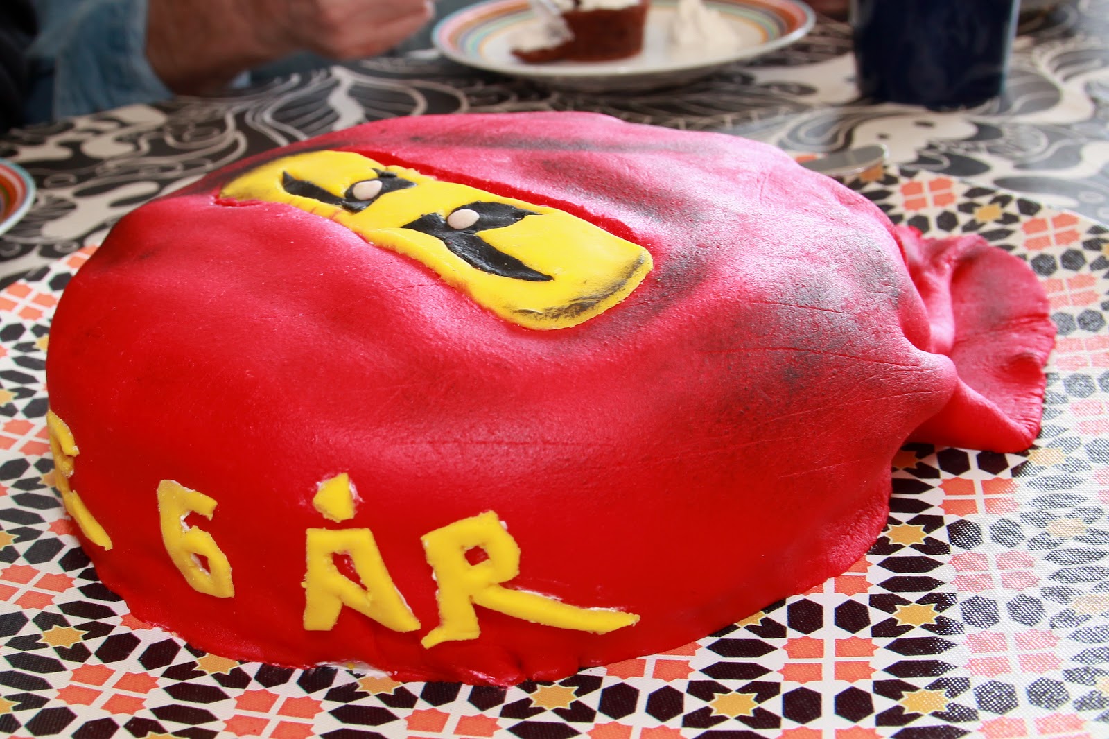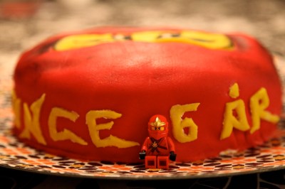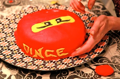 Jag fick en del gul marsipan över och använde den till att skära ut bokstäver till födelsedagsbarnets namn i Ninjagostil. Blev lyckat, vid första anblick trodde han att det stod Ninjago och inte hans namn. Det tar jag som en komplimang. 🙂