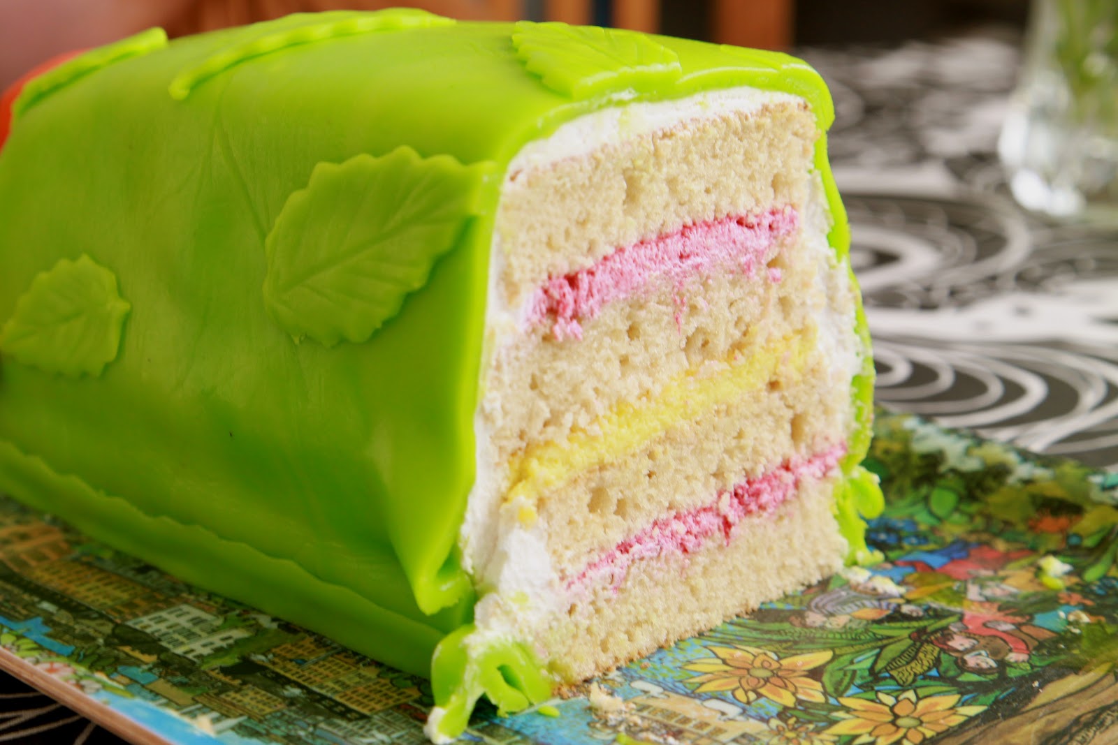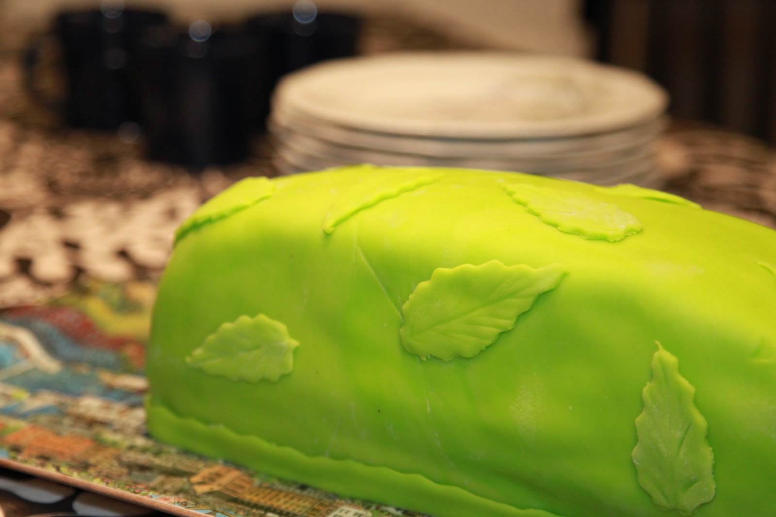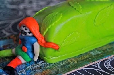 Färga marsipanen till den färg du vill ha tårtan i och kavla sedan ut den jämnt för att passa tårtan. Lägg på marsipanlocket över tårtan och garnera enligt det tema du gillar. I detta fall var det grön färg för oss då det skulle vara gräs och löv. Jag gjorde det väldigt enkelt och skårade bara lite med baksidan av en sked för att göra lite struktur. Någon konstnär kommer jag aldrig att bli men gott är det ändå. Lite för gott kanske… 😉