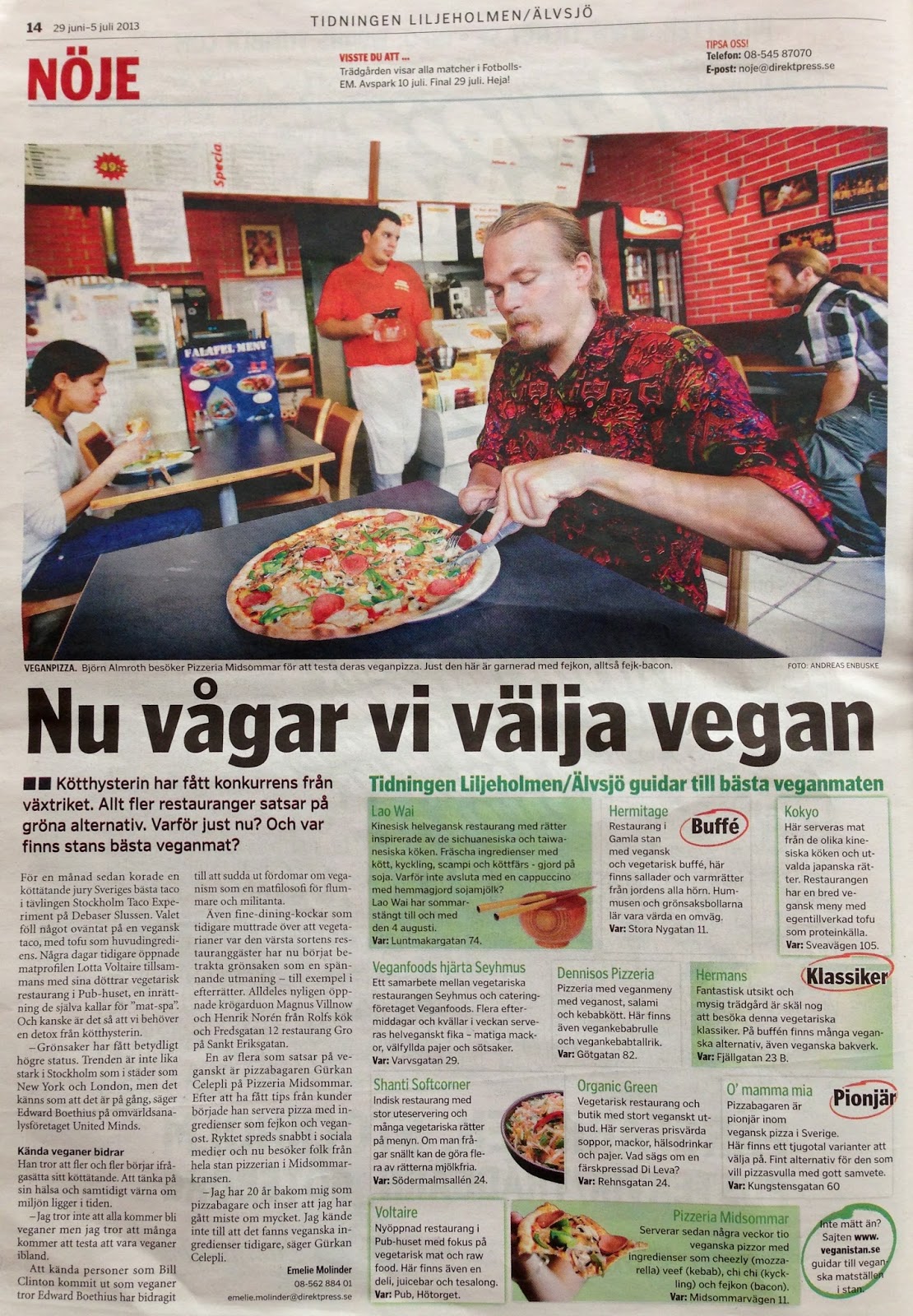 I artikeln skriver de om hur allt fler restauranger satsar på gröna alternativ och att grönsaker har fått allt högre status. De tipsar också om en del bra restauranger och självfallet nämner man den lokala pizzerian som börjat med vegpizza, Pizzeria Midsommar i Midsommarkransen. De har gjort det efter att ha fått tips från kunder och har nu alltså utökat sitt utbud med dels vegetarisk ost men även en del ingredienser som kan ses som ersättning för t.ex. salami, kebab och kyckling. ”Jag har 20 år bakom mig som pizzabagare och inser att jag har gått miste om mycket. Jag kände inte till att det fanns veganska ingredienser tidigare” säger Gürkan Celepli på pizzerian.