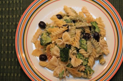 Sätt ugnen på 200°C. Koka pastan enligt anvisning på paketet. Låt broccolin koka med några minuter på slutet. Halvera oliverna och blanda ner dem i pastan, salta och peppra. Häll pastablandningen i en smord, ungssäker form.