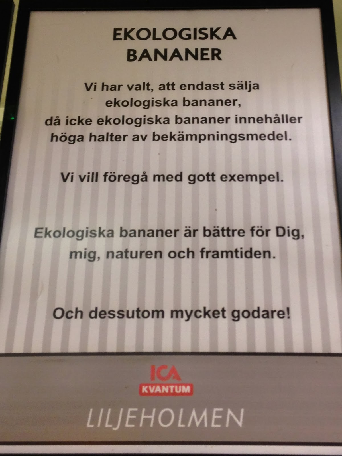 Jag tycker det är så otroligt trevligt att fler och fler butiker börjar ta sitt ansvar och förespråkar eko. Ser allt fler bilder florera på Facebook och senast såg jag själv den här skylten på Ica i Liljeholmen. Underbart beslut att gå över till ekologisk frukt på detta sätt. Hoppas att alla butiker går över till detta. För vem vill äta gift? För att inte tala om att ge sina barn det. Heja Eko!