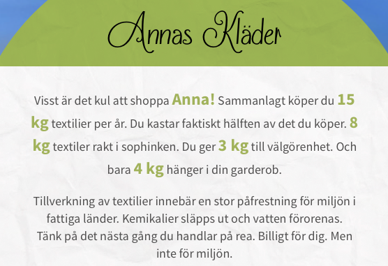 Man kan även göra ett test för att få fram sin personliga historia om sitt avfall där det räknas fram hur mycket avfall man orsakar. Min historia säger att jag har ägt 7 mobiltelefoner vilket nog är rätt så överensstämmande. Tillverkningen skapar 75 kg avfall per telefon. Det hävdas att jag köper 15 kg textilier per år och slänger 8 kg av dem vilket är långt ifrån sanningen men jag tycker det är läskigt att somliga å andra sidan köper långt mer. Och för mig är det fullständigt obegripligt att man slänger kläder! Återvinn, ge bort, släng inte! Själv är jag usel på att handla kläder, bra ur miljöhänseende men mindre smickrande på jobbet där man kan tänkas förväntas komma i ett helt och snyggt skick…