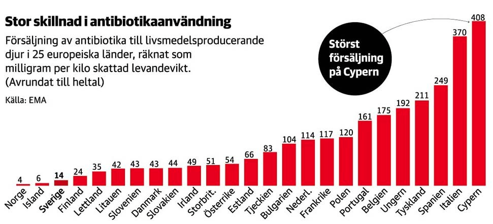 Diagrammet visar hur enorma skillnaderna är. Sverige ligger med sina 14 milligram per kilo lågt i jämförelse men ändå mer än tre gånger mer än Norge. Dags att både politiker och konsumenter sätter sig in i vidden av detta problem och kräver förändring.