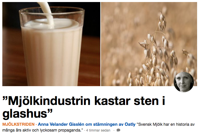 I går publicerades en debattartikel på SVT Opinion från Vego Eco med anledning av Svensk Mjölks stämning av Oatly som togs upp här för några dagar sedan. Nu när jag äntligen har möjlighet att besvara alla kommentarer, vilket många i och för sig redan gjort åt mig – tack! – så har kommentarsfältet hunnit stänga. Svarar därför här istället och det visade sig inte vara så många olika åsikter utan handlade främst om formuleringarna, min kommentar om företagens storlek, lidande samt huruvida komjölk är naturligt eller inte.