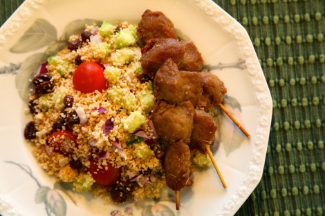Couscoussallad med tzayspett till höger på vit åttakantig tallrik sedd ovanifrån, står på grön textiltablett.