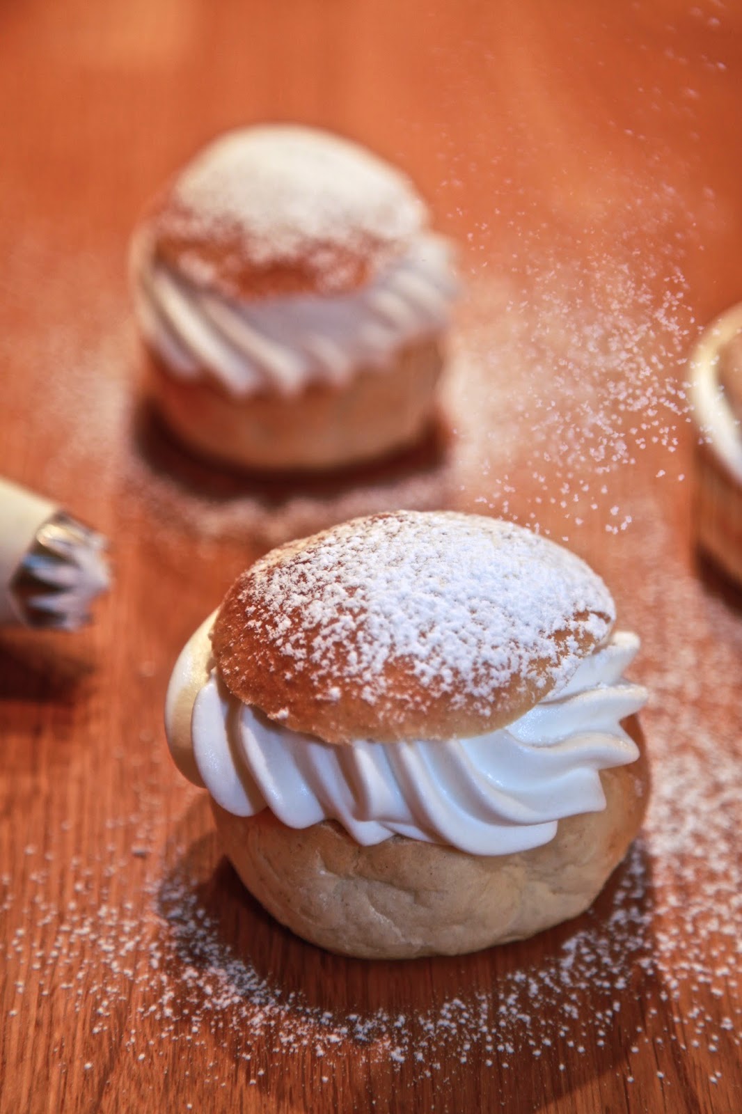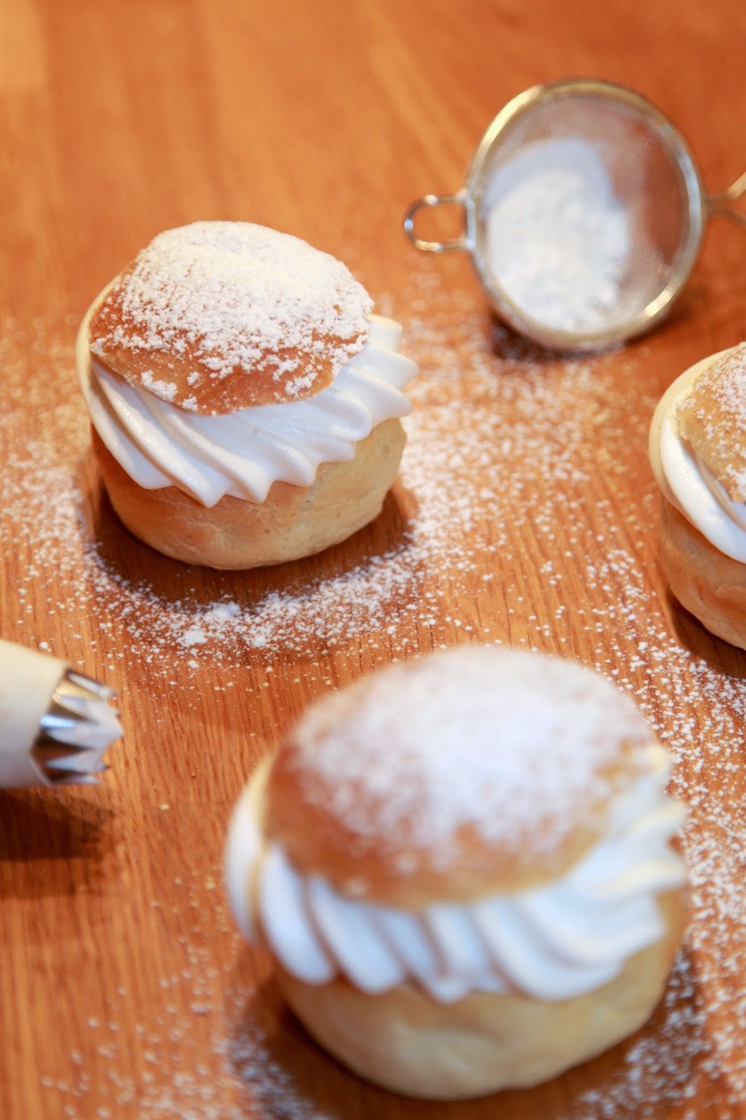 Vispa grädden riktigt fluffig, använder du växtbaserad så brukar högsta hastighet på vispen i fem minuter vara att rekommendera. Skär av lock på semlorna och ta ur lite av inkråmet och blanda tillsammans med mandelmassan. Tillsätt lite mjölk och rör ihop till den konsistens du tycker är lagom fast/lös. Klicka ut madelmassesmeten på semlorna. Spritsa eller klicka ut grädden och lägg på locket. Pudra över florsocker, sedan är det dags för fika!