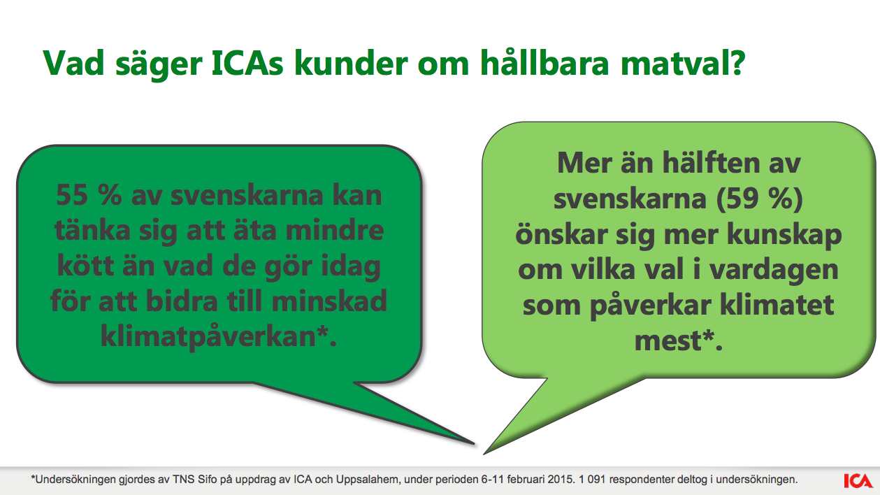 Anna Karin Lindberg som arbetar med hållbarhetsfrågor inom mat på Ica berättade inledningsvis att det är ett samarbete med WWF Sverige, representerat av Anna Richert. De påminde om vad som är de värsta bovarna; matsvinet och köttkonsumtionen. Är det något man som privatperson kan göra för klimatet så är det att tänka på dessa saker. Maten räcker för att försörja världen om man slutar slänga mat och fördelar den rätt, dvs inte ger merparten till djur som sedan äts av ett i sammanhanget fåtal människor.