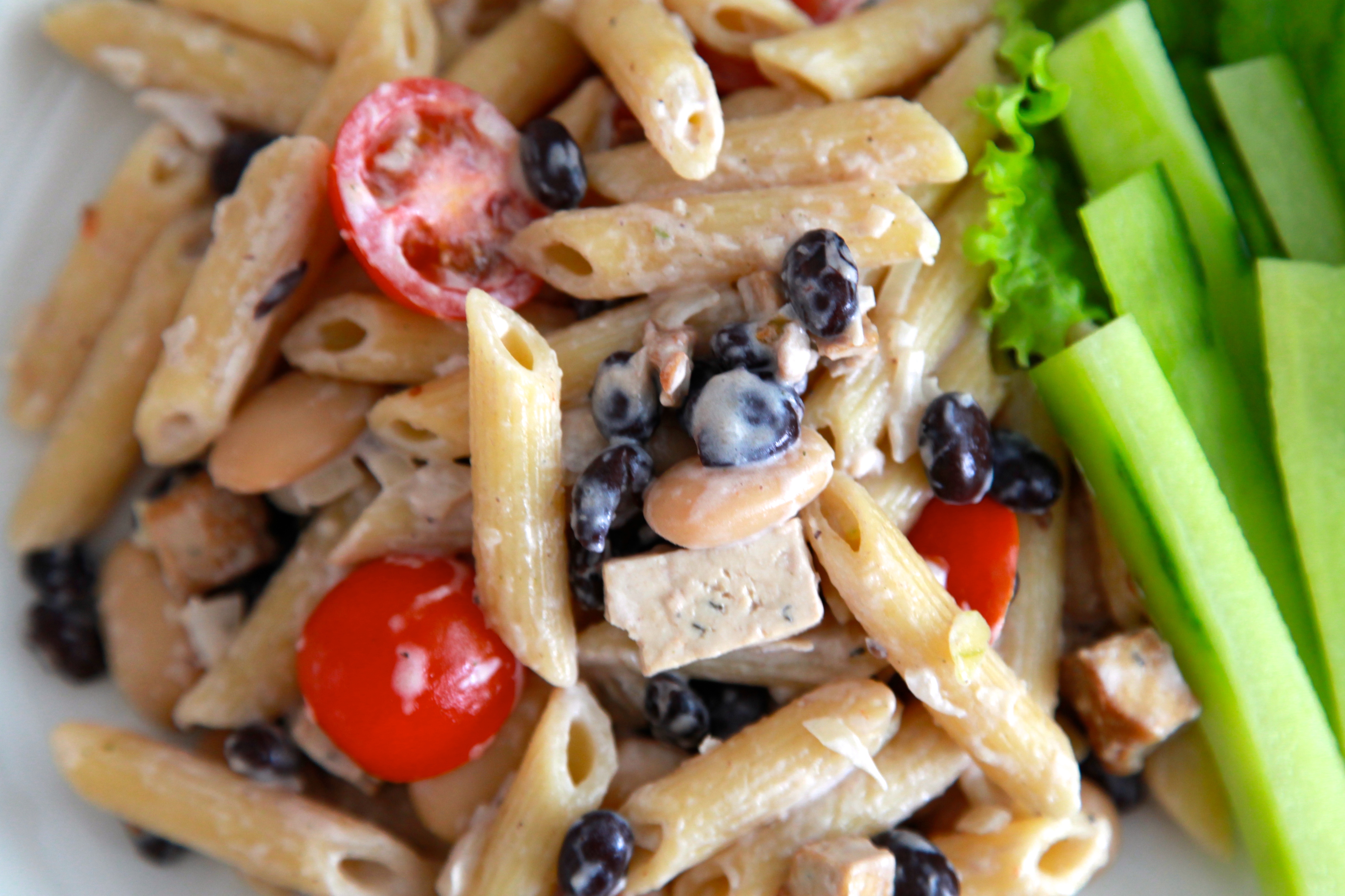 Tärna tofun och stek i olja tills den fått en fin yta. Skölj bönorna, halvera tomaterna. Blanda alla ingredienserna med den kokta pastan och tillsätt ev mer krydda. Servera med sallad och gärna färsk basilika.