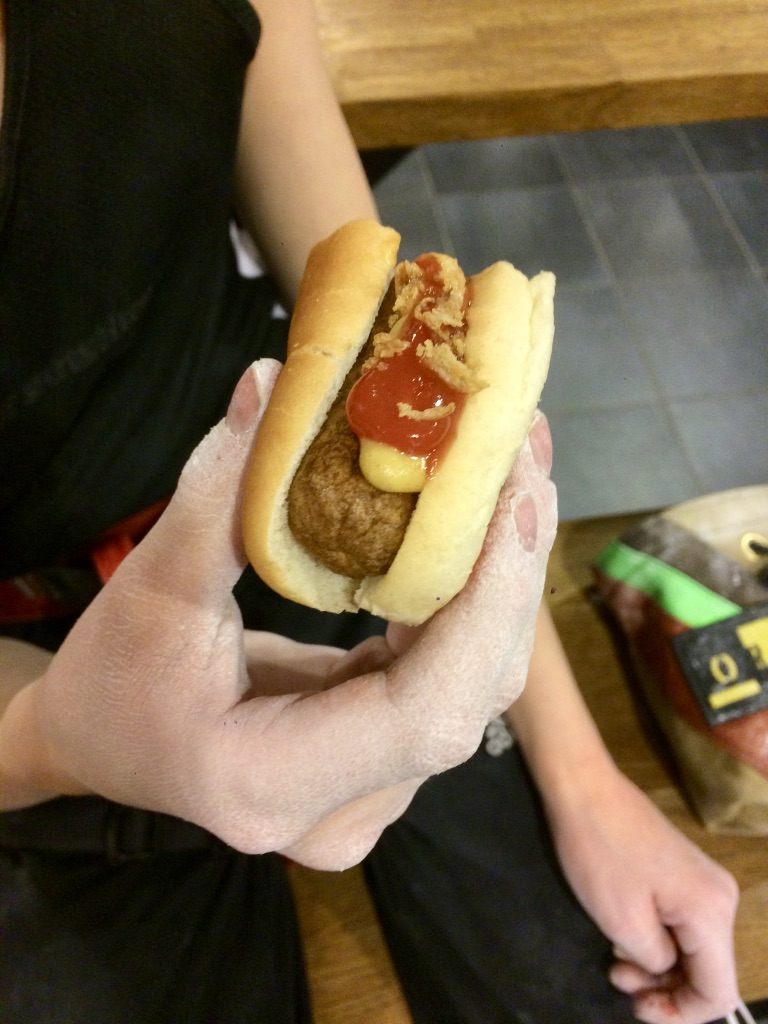 När vi idag var på just ett sådant ställe, ett café med servering av korv och pizza så noterade vi att det stod på menyn att det var “vegkorv” och “veganpizza”. Lät ju lovande men såg samtidigt grillen där korvarna låg. Inte lockande… Med tanke på barnens hunger så frågade jag ändå om det var så att de hade separat grill för vegkorven. Tappade bokstavligen hakan när jag fick svaret att de bara hade vegetarisk korv så det var inget att bekymra sig för. Helt fantastiskt! Och vegansk pizza. “Händer detta?!” tänkte jag stilla och det gjorde det. En milstolpe i veganlivets strävan om normalisering av vegetarisk kost.
