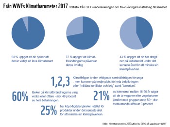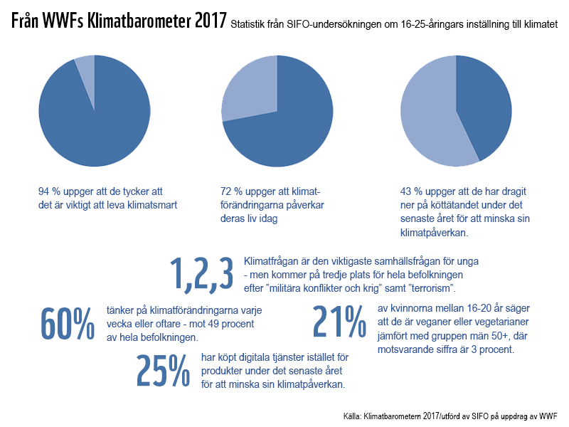Klimatbarometern 2017 visar att klimatförändringarna är den viktigaste samhällsfrågan idag för unga mellan 16 – 25 år. Sex av tio tänker på klimatförändringen minst en gång i veckan och oroar sig över klimatets påverkan på framtiden.