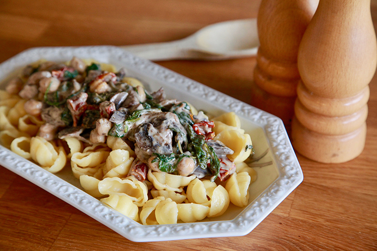 Koka pastan enligt anvisning på förpackningen. Skiva svampen och finhacka vitlöksklyftorna. Fräs detta i olja i en panna tills vätskan har dunstat. Strimla under tiden de soltorkade tomaterna och tillsätt dem och spenaten. Låt fräsa någon minut. Skölj kikärtorna, rör ner dem och Fraichen. Koka upp och smaka av med kryddor. Ta bort från plattan när det kokat upp, det ska bara bli varmt.
