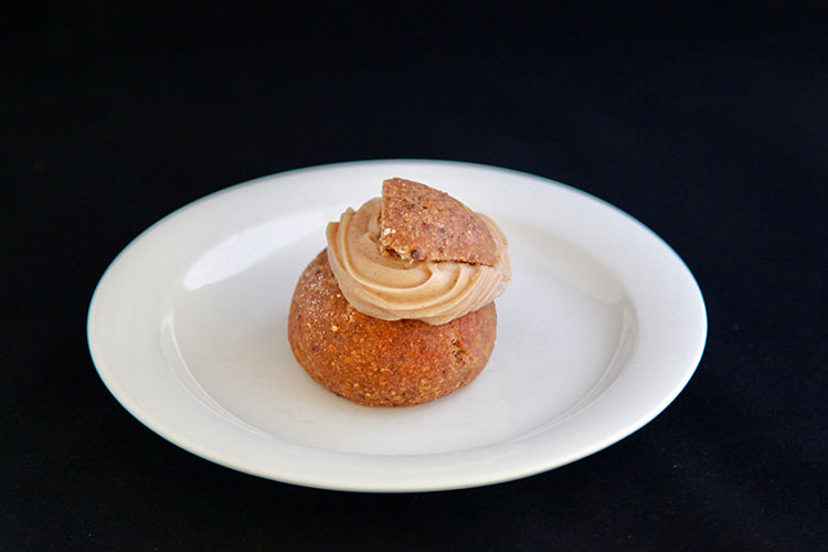 En besvikelse. Dessa semlor som lät så goda med bas på mandelmjöl och med cashewgrädde. Men det säger klonk när en lägger upp dem. Liten och väldigt tung bulle som ger ett oaptitligt intryck. Smakar pepparkaka, den är hård, stabbig och växer i munnen. Grädden är seg med en hinna på. Allt hårt och torrt, grädden smakar inte mycket och är ändå så lite av att det inte hjälper mycket till den torra bullen ändå.