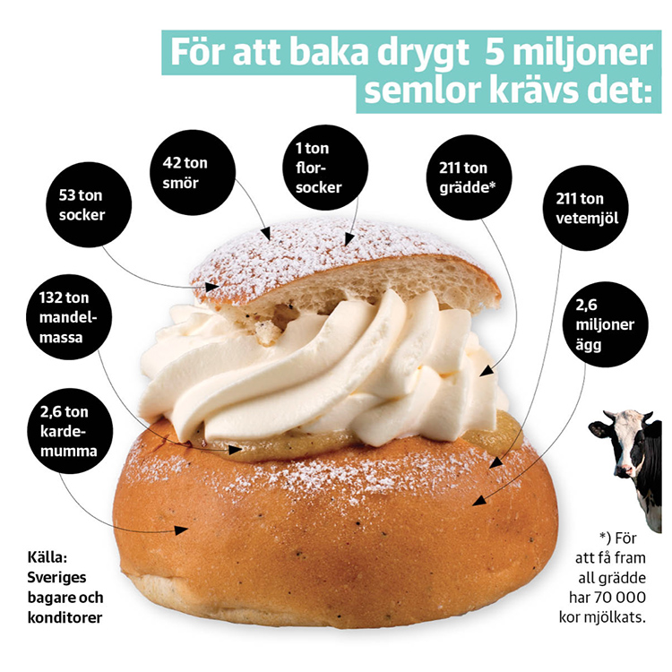 Enligt statistik från Sveriges bagare och konditorer går det åt 211 ton grädde vilket innebär att 70 000 kor har mjölkats. Då pratar vi grädde. Till detta kommer även 42 ton smör. Brutala mängder där tusentals djur får lida och så även vårt klimat då mejeriindustrin har stor negativ klimatpåverkan.